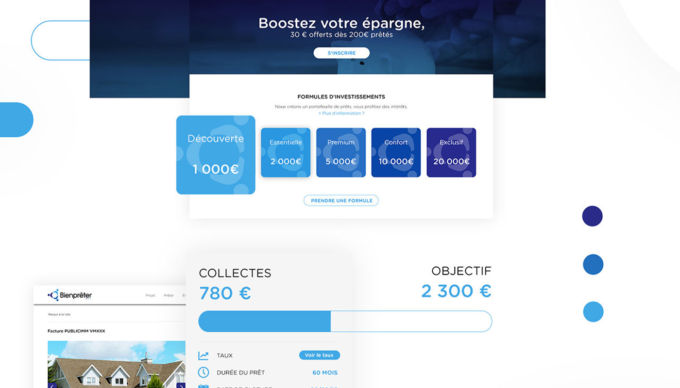 Plateforme d'investissement crowlending, ergonomie et design de la partie vitrine et useroffice. Création de la charte graphique complète avec logo.